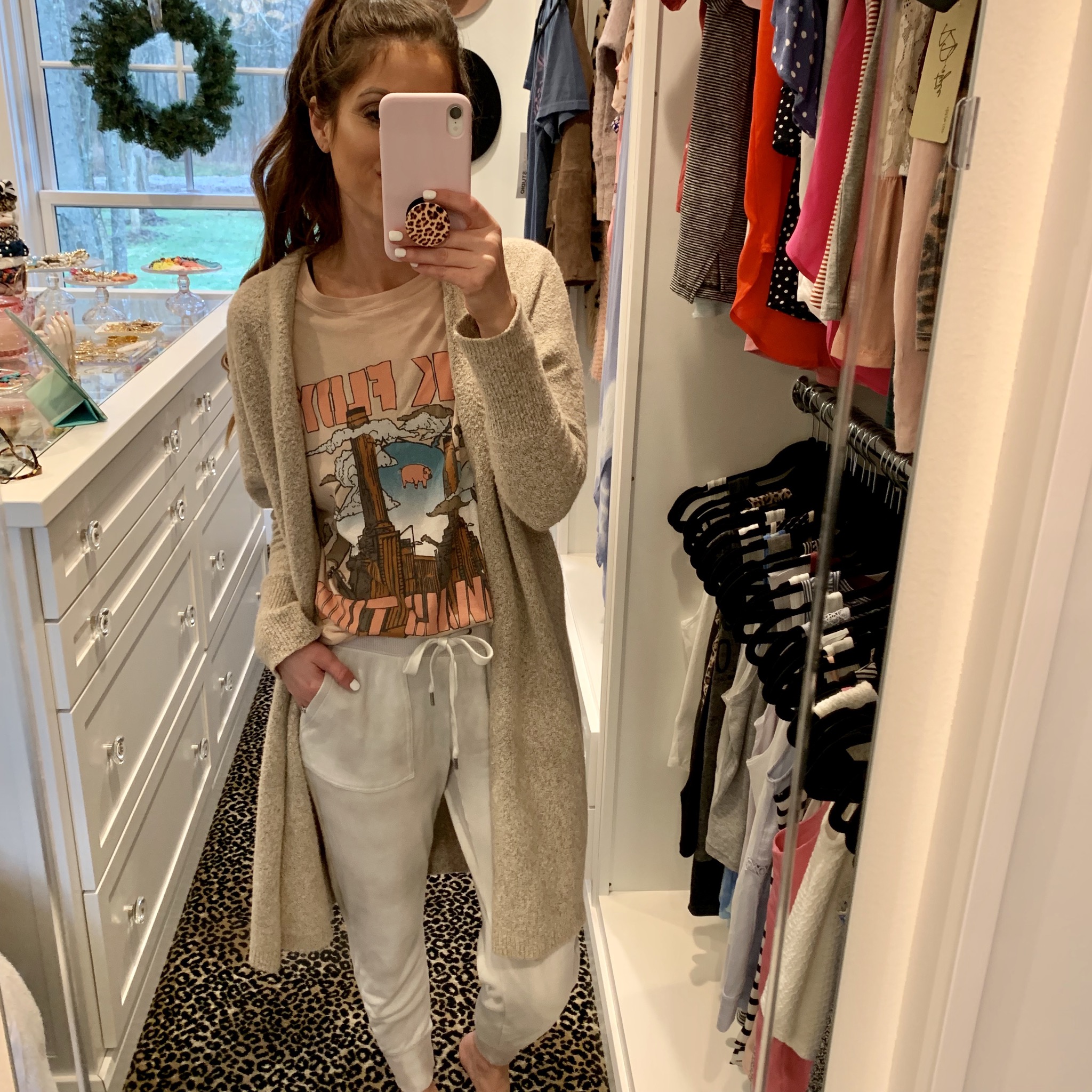 Taking this look from lunch to lounge yesterday. I love buying pieces that I can wear dressed up or down because I get so much more use out of them. I also can justify spending more money on clothing I know I can wear so many different ways. You see me wearing so many of the same pieces of clothing on here, and I love showing you guys how to style the same clothes different ways. You get so much more bang for your buck, and for me that’s so important. I’m wearing a size small in this Pink Floyd tee, and this is hands down my favorite graphic tee! As someone who owns so many graphic tees, that’s saying a lot. This sweater is one that I own in three different colors. It is seriously so so soft and cozy. It feels like you’re wrapped up in a blanket. I’m wearing an xs and it definitely has an oversized fit. It’s always hard to photograph the colors of these joggers, but they’re actually a really faed tie dye. I loved them so much that once they were on sale a bought a second pair in the same color and also in a navy tie dye. Unfortunately, these are old and no longer available but I’m linking some of my favorite joggers that I do own and are still available in all sizes and multiple colors. I love joggers because I not only wear them lounging around the house but also to run errands. In all the joggers I linked I wear an xs for reference.